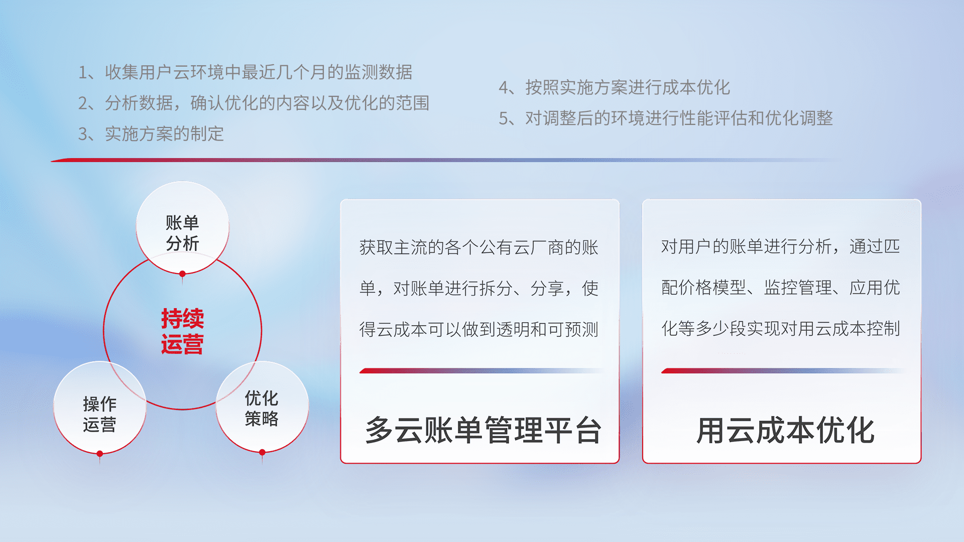 通过多云纳管,,,,以统一的资源数据模型把客户的云资源进行抽象和封装,,,进而实现对多云资源的统一操作,,保障云资源管理的可靠性、、稳定性与可用性。。。量身定制化运维内容,,配置、、开发运维、、、补丁管理、、、、备份、、、监控、、认证和访问管理、、、、审计和日常巡检等,,保障在用云过程中的可靠度,,稳定度以及高可用率。。
